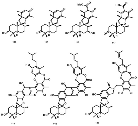Chermesins A-D (114–117) (Figure 12), three spiropyranoquinone drimanes, were isolated from the culture extract of the algicolous fungus Penicillium chermesinum EN-480 which was obtained from the marine red alga Pterocladiella tenuis. Compounds 114–117 were assayed for their antimicrobial activity against four human pathogenic bacteria (E. coli, Micrococcus luteus and P. aeruginosa) and yeast (C. albicans), five plant pathogenic fungi (Alternaria brassicae, Colletotrichum gloeosporioides, Fusarium oxysporum, Gaeumannomyces graminis, and Physalospora piricola) and five aquatic bacteria (Aeromonas hydrophila, Edwardsiella tarda, Vibrio alginolyticus, V. harveyi, and V. parahemolyticus). Compounds 114 and 115 were active against C. albicans, E. coli, M. luteus, and V. alginolyticus, with MIC values ranging from 8 to 64 μg/mL, whereas 117 only showed weak activity against E. coli (MIC = 64 μg/mL). Compound 116 exhibited no activity against all of the tested strains [47]. Chartarolides A–C (118–120) (Figure 12), another spirobenzopyran drimanes isolated from the fermentation broth of the marine-derived fungus Stachybotrys chartarum WGC-25C-6, which was obtained from the marine sponge Niphates recondite, exhibited significant cytotoxicity against a panel of human tumour cell lines including HCT-116 (colon carcinoma), HepG2, BGC-823 (gastric carcinoma), NCI-H1650 (nonsmall cell lung carcinoma), A2780 (ovarian carcinoma) and MCF-7, with IC50 values ranging from 1.4 to 12.5 μM. These compounds also exhibited durable inhibitory activities against four tumour-associated protein kinases, including FGFR3, IGF1R, PDGFRb and TrKB, with IC50 values ranging from 2.6 to 25 μM [48].