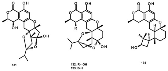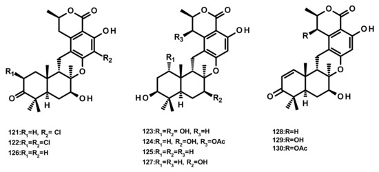 Ten isochromone-based drimanes, including chrodrimanins K (121), L (122), M (123), N (124), H (126), F (127), E (128), A (129) and B (130) and hydroxypentacecilide A (125) (Figure 13), were isolated from the fermentation broth of Penicillium sp. SCS-KFD09 which was obtained from a marine worm Sipunculus nudus. Compounds 121, 124 and 125 (Figure 13) displayed weak antiviral activity against the influenza A virus (H1N1) with IC50 values of 74, 58, and 34 μM, respectively [31]. Compounds 129 and 130 were also isolated from the culture extract of the endophytic fungus Talaromyces amestolkiae YX1, obtained from healthy leaves of the mangrove tree Kandelia obovata, collected from Zhanjiang Mangrove Nature Reserve in Guangdong, China [20].