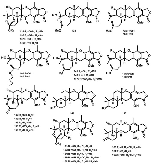 Five austalides M-Q (135–139) (Figure 15) were isolated from the marine-derived fungus Aspergillus sp. which was obtained from the Mediterranean sponge Tethya aurantium. Compounds 135–139 were evaluated for their cytotoxic activity against the murine cancer cell line L5178Y by the MTT assay; however, none of them were active [49]. Australide H acid butyl ester (140), australide H acid (141), australide P acid butyl ester (142), australide P acid (143), australide Q acid (144), 13-O-deacetylaustalide I (147) and 13-deacetoxyaustralide I (148) (Figure 15) were isolated from the culture extract of Penicillium thomii KMM 4645 whereas 141–144, 147, 148, 13-deoxyaustralide Q acid (145), 17-O-demethylaustalide B (146) and 17S-dihydroaustalide K (149) (Figure 15) were isolated from the culture of P. lividum KMM 4645. Both of the fungal strains were isolated from the superficial mycobiota of the brown alga Sargassum miyabei, collected from the Sea of Japan [50]. Compounds 140, 141, 146, and 148 did not exhibit cytotoxicity against MDA-MB-231 and JB6 Cl41 (mouse epidermal) cell lines; however, these compounds inhibited AP-1-dependent transcriptional activity in JB6 Cl41 cell line at noncytotoxic concentrations after 12 h of treatment. Interestingly, these compounds showed significant inhibitory activity at a concentration of 6.25 μM but did not reduce cell viability at 100 μM [50]. Moreover, 140–144, 147, and 148 exhibited strong inhibitory activity against endo-1,3-β-d-glucanase, obtained from a crystalline stalk of the marine mollusk Pseudocardium sachalinensis [50]. The culture extract of the marine sponge-associated fungus Aspergillus aureolatus HDN14-107, isolated from an unidentified sponge, furnished 143, 147, austalides S-U (150–152), A (153), B (154), D (155), E (156), G (157), I (158), J (159), L (160) (Figure 15). Compounds 152 and 154 displayed an antiviral activity against the influenza A virus (H1N1), with IC50 values of 90 and 99 µM, respectively [18]. Austalides V-X (161–163) (Figure 15) were isolated, together with 138, 139, 143, 148, 149 and 160, from the marine sediment-derived fungus Penicillium rudallense. Compounds 161 and 162 displayed significant inhibitory activity on RANKL-induced osteoclast differentiation with ED50 values of 1.9–2.8 μM [32].