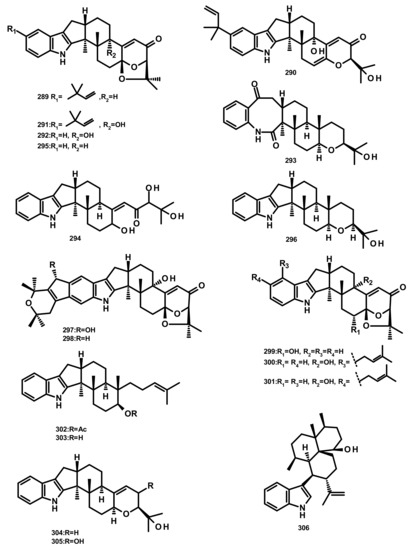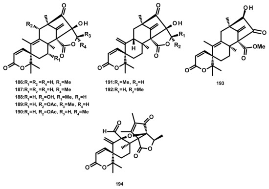 The previously unreported austinoid derivatives, brasilianoids G (194) (Figure 18), H (170), I (171) J (179) and L (192) were reported, together with the previously described austinoids including 165, 166, 169, 172, 173, 174, 188 and 191, from the marine-derived fungus Penicillium brasilianum WZXY-M122-9, isolated from a marine sponges collected from the South China Sea. None of the isolated compounds exhibited either cytotoxicity against A549, RAW264.7 (mouse monocyte/macrophage) and IEC-6 (rat small intestine epithelial) cell lines or antibacterial activity against Gram-positive bacteria S. aureus ATCC 29,213 and a clinically isolate Gram-negative bacteria Klebsiella pneumoniae 58AP) [58] (Figure 18).