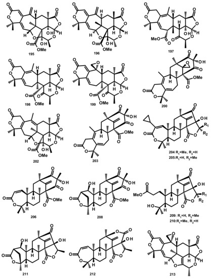 Chemical structures of preaustinoids 195–200, 202–206 and 208–213.