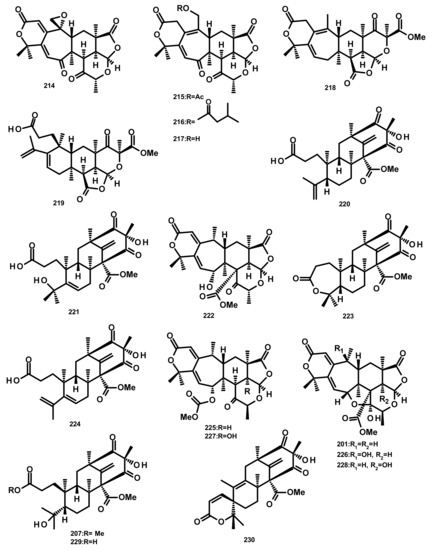 Chemical structures of preaustinoid derivatives 201, 207 and 214–230.
