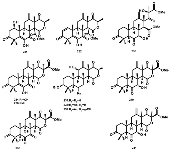 Terretonins E (231) and F (232) (Figure 21) were isolated from the culture extract of the marine derived-fungus Aspergillus insuetus, isolated from the marine sponge Petrosia ficiformis which was collected in the Mediterranean Sea. Compounds 231 and 232 inhibited NADH oxidase activity (in beef heart submitochondrial particles) with IC50 values of 3.90 ± 0.4 and 2.97 ± 1.2 µM, respectively [65]. The culture extract of the marine sponge-associated fungus Aspergillus sp. OPMF00272 furnished terretonin G (233) and terretonin (234) (Figure 21). Compound 233 (20 mg per 6 mm disk) exhibited antibacterial activity against Gram-positive bacteria (S. aureus FDA209P, B. subtillis PCI219 and M. luteus ATCC9341), but not against Gram-negative bacteria (P. aeruginosa IFO12689 and E. coli JM109) and yeast (C. albicans ATCC64548 and S. cerevisiae S288c) [66]. Chemical examination of the endophytic fungus Aspergillus terreus EN-539, obtained from the fresh tissue of the marine red alga Laurencia okamurai which was collected from the coast of Qingdao, China, led to the isolation of the previously unreported terretonin analogue, aperterpene O (235), together with the previously described terretonins A (236) (Figure 21) and G (233) [67]. Compound 233 exhibited antimicrobial activity against M. luteus and S. aureus with MIC values of 32 and 8 μg/mL, respectively [67]. A new terretonin analog terretonin O (237) was isolated, together with the previously reported terretonins M (238) and N (239) (Figure 21) from the culture extract of Aspergillus terreus LGO13, obtained from a sediment sample collected from sewage water containing heavy metals. Compound 237 displayed weak antimicrobial activity against P. aeruginosa and S. aureus [68]. The previously unreported terretonin D1 (240) (Figure 21) was isolated, together with the previously described 234, 236 and terretonin D (241) (Figure 21), from the marine-derived fungus Aspergillus terreus ML-44, obtained from the fresh gut of pacific oyster. All the isolated compounds displayed a weak inhibition of NO production in the LPS-stimulated RAW264.7 macrophages [69]. It is interesting to note that only the relative configurations of the structures of 231–233 were determined. On the contrary, the absolute configurations of the stereogenic carbons of 237–241 were established, with absolute confidence, by X-ray analysis using CuKα radiation with good Flack parameter. Therefore, it is possible that the structures of 231–233 are the enantiomeric form of their correct structures.