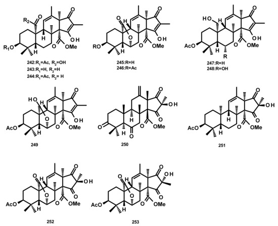 The andrastin derivatives, 15-deacetylated citreohybridone E (242), 3-deacetylated andrastin A (243), andrastin A (244), 3-deacetylcitreohybridonol (245), citreohybridonol (246), andrastin B (247), 6-α-hydroxyandrastin B (248) and dihydrocitreohybridonol (249) (Figure 22), were isolated from the marine-derived fungus Penicillium sp. YPGA11, obtained from the deep-sea water at a depth of 4500 m in the Yap Trench, West Pacific Ocean. Compounds 242–249 exhibited inhibitory activity against NO production in LPS-activated RAW 264.7 macrophages with inhibition rates ranging from 60% to 90% at 50 μM, but decreased sharply at 25 μM. Since these compounds were also cytotoxic to the RAW 264.7 cells (45–65% inhibition at 50 μM), it is believed that their inhibition of NO production was attributed to cell death [70]. Chemical examination of the algicolous fungus Aspergillus terreus EN-539 led to the isolation of another andrastin derivative named aperterpene N (250) [67]. Compound 250 (Figure 22) displayed the in vitro inhibitory activity against the influenza neuraminidase with an IC50 value of 18.0 nM [67]. Andrastone A (251), 16-epi-citreohybriddione (252) and citreohybriddione A (253) (Figure 22) were recently isolated from the marine-derived fungus P. allii-sativi, isolated from the deep-sea water of the western Pacific. All the isolated compounds were evaluated for their antiproliferative effects against HepG2, A549, BIU-87 (urinary bladder), BEL-7402, ECA-109 (esophageal squamous carcinoma), HelaS3 (cervix), and PANC-1 (prancreatic) human tumour cell lines; however, only 251 displayed significant activity, with selective effect against HepG2 tumour cells with an IC50 = 7.8 µM. Compound 251 also significantly increased caspase-3 and caspase-8 activities, but exhibited almost no effect on caspase-9. Moreover, this compound was found to increase the reporter transcriptional activation of RXRα (retinoid X receptor α) while reducing the transactivity of RXRα induced by 9-cis-retinoic acid in the luciferase reporter gene assay [71]. It is interesting to note that the absolute configurations of the stereogenic carbons of the sesquiterpene skeleton of 250, i.e., C-5, C-8, C-9, C-10, C-13 and C-14 are opposite to those of 242–249 and 252–253. Biogenetically, this is improbable. Even though the absolute structures of 249 [70] and 253 [71] were established by X-ray analysis, and those of 242–244 [70], 251 and 252 [71] were determined by comparison of the experimental and calculated (using TDDFT) ECD spectra, the parameters of the methods of determination of the configurations such as the flack parameter (in X-ray crystallography) and the precise wave length in the ECD curves of the experimental and calculated spectra should be duly taken into consideration.
