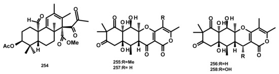 The highly oxygenated merosesquiterpenes containing a rearranged drimane linked to an isochromone moiety, aspertetranones A–D (255–258) (Figure 23), were isolated from the culture extract of the endophytic fungus Aspergillus sp. ZL0-1b14 obtained from the marine green algal species of the genus Enteromorpha, which was collected from Jinjiang Dongshi salt pan in Fujian Province, China. Compounds 255–258 displayed weak inhibitory activities against TNF-α and NO production by LPS-stimulated RAW264.7 macrophages [73].