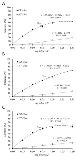 Dose-response inhibition plot of S. aurata (A), S. senegalensis (B) and D. labrax (C) intestinal proteases activity following the incubation with increasing concentrations of crude (CR-Ulva) and heat-treated Ulva extracts (HT-Ulva). Each point represents the mean of triplicates ± SD. IC50: mg of Ulva needed to cause 50% protease inhibition.