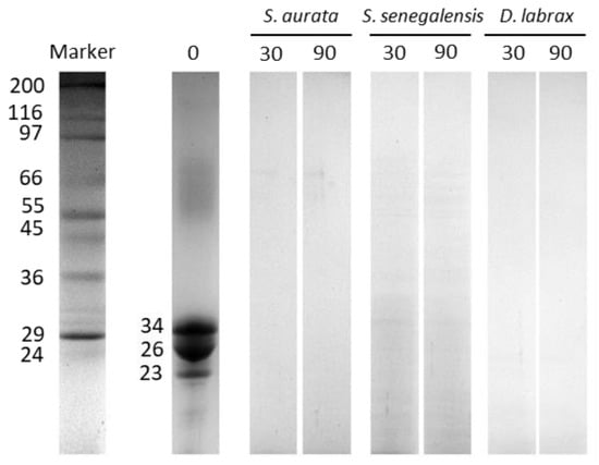Proteinograms of casein hydrolyzed by fish digestive enzymes are shown in Figure 3. All the main casein fractions (34, 26 and 23 kDa), corresponding to α, β and κ subunits, were hydrolyzed after 30 min.