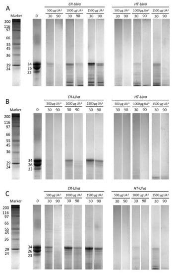 In addition, the formation of proteinaceous enzyme-inhibitor complexes was determined by using substrate-SDS-PAGE electrophoresis gels. Samples were prepared by preincubating crude or heat-treated (100 °C, 5 min) Ulva extracts with a trypsin solution (1 µg mL−1) at a ratio of 500 µg of Ulva per µg trypsin for 0, 30 and 60 min at room temperature. Samples were mixed (1:1) with SDS sample buffer (0.125 M Tris HCl, pH 6.8; 4% (w/v) SDS; 10% (v/v) β-mercaptoethanol; 20% (v/v) glycerol; 0.04% (w/v) bromophenol blue and SDS-PAGE was performed according to Laemmli [39] using 12% polyacrylamide gels (100 V per gel, 45 min, 4 °C). After electrophoresis, gels were washed with distilled water prior to staining with Coomassie Brilliant Blue R-250 in a methanol-acetic acid solution overnight. Finally, distaining was done with a methanol-acetic acid-water solution. In addition, 5 μL of a wide-range molecular weight marker (S-84445 SigmaMarker™, St. Louis, MO, USA) were included in each gel. The molecular marker consisted of 12 proteins ranging from 6.5 kDa (aprotinin, bovine lung) to 200 kDa (myosin, porcine heart).