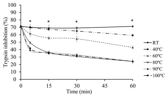 The effects of thermal treatments on the inhibitory effect of Ulva on trypsin activity. * Denote significant differences among treatments (p < 0.05).