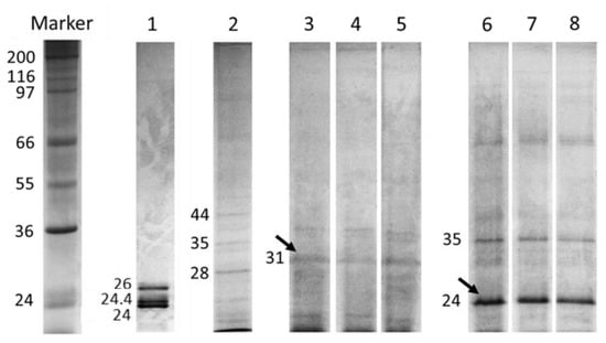 - Laemmli, U.K. Cleavage of structural proteins during the assembly of the head of bacteriophage T4. Nature 1970, 227, 680–685. [Google Scholar] [CrossRef]