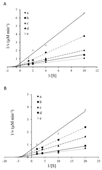 Lineweaver–Burk plots showing the inhibition of trypsin (A) and chymotrypsin (B) by Ulva protease inhibitors (a: 0; b: 200; c: 300; d: 400 and e: 500 µg Ulva per µg enzyme).