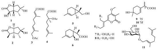 - Gong, T.; Zhen, X.; Li, B.J.; Yang, J.L.; Zhu, P. Two new monoterpenoid alpha-pyrones from a fungus Nectria sp. HLS206 associated with the marine sponge Gelliodes carnosa. J. Asian Nat. Prod. Res. 2015, 17, 633–637. [Google Scholar] [CrossRef] [PubMed]