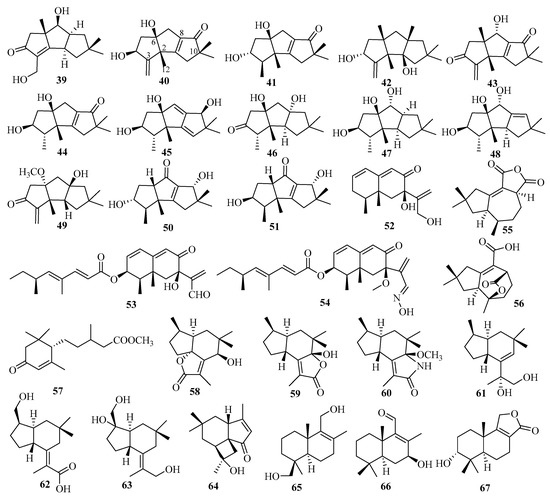 - Huang, L.; Lan, W.J.; Li, H.J. Two new hirsutane-type sesquiterpenoids chondrosterins N and O from the marine fungus Chondrostereum sp. Nat. Prod. Res. 2018, 32, 1578–1582. [Google Scholar] [CrossRef] [PubMed]