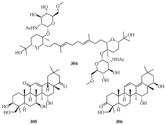 - Elnaggar, M.S.; Ebada, S.S.; Ashour, M.L.; Ebrahim, W.; Singab, A.; Lin, W.; Liu, Z.; Proksch, P. Two new triterpenoids and a new naphthoquinone derivative isolated from a hard coral-derived fungus Scopulariopsis sp. Fitoterapia 2017, 116, 126–130. [Google Scholar] [CrossRef] [PubMed]