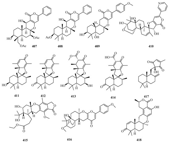 - Luo, X.W.; Chen, C.M.; Li, K.L.; Lin, X.P.; Gao, C.H.; Zhou, X.F.; Liu, Y.H. Sesquiterpenoids and meroterpenoids from a mangrove derived fungus Diaporthe sp. SCSIO 41011. Nat. Prod. Res. 2019. (online). [Google Scholar] [CrossRef]