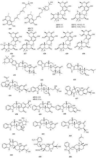 - Liu, D.; Li, Y.; Li, X.; Cheng, Z.; Huang, J.; Proksch, P.; Lin, W. Chartarolides A-C, novel meroterpenoids with antitumor activities. Tetrahedron Lett. 2017, 58, 1826–1829. [Google Scholar] [CrossRef]