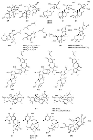 - Niu, S.; Xie, C.L.; Xia, J.M.; Liu, Q.M.; Peng, G.; Liu, G.M.; Yang, X.W. Botryotins A–H, tetracyclic diterpenoids representing three carbon skeletons from a deep-sea-derived Botryotinia fuckeliana. Org. Lett. 2020, 22, 580–583. [Google Scholar] [CrossRef]