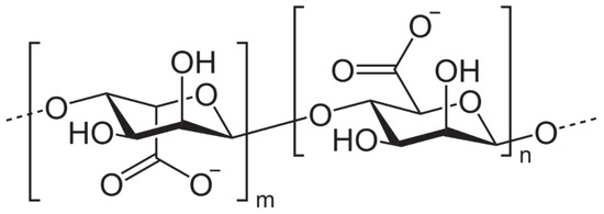 Alginates (Figure 3) are polysaccharides. They are compounds (1,4-polyuronic) containing three types of block structure: M block (β-D-mannuronic acid), G block (poly α-L-guluronic acid), and MG block (containing both polyuronic acids), naturally present in the cell wall and extracellular matrix of various species of brown algae or Phaeophyceae and which can represent up to 40% of the biomass.