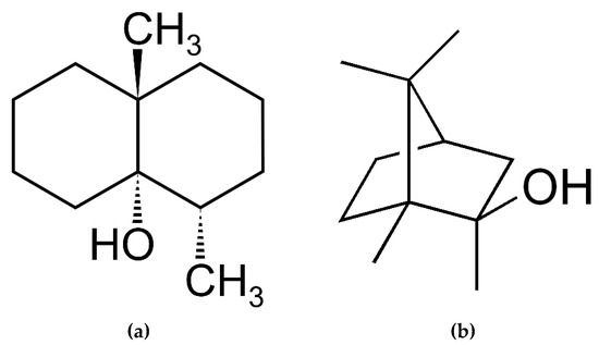 Over 35,000 species of algae are capable of releasing odors in aquatic environments, although few of them have been characterized in terms of their effects on human health [94]. The type of odor varies depending on the molecules produced by the various taxa [95,96]. The main odorous components produced by algae and cyanobacteria are terpenoids, carotenoids, fatty acid derivatives and sulfur compounds [97]. Some of the closely studied odorous compounds are geosmin or trans-1, 10-dimethyl-trans-9-decalol (Figure 6) and 2-methylisobornéol (MIB) with earthy/musty odors [98,99,100,101].