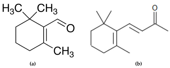 Figure 7. Chemical structure of bêta-cyclocitral (a) and bêta-ionone (b).