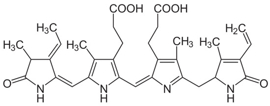 The tetrapyrroles called phycobilins represent the main photosynthetic accessory pigments of certain cyanobacteria and eukaryotic algae belonging to the Glaucophyte, Crystophyte and Rhodophyte groups. These pigments are covalently bound proteins, called phycobiliproteins, which are, in general, organized into phycobilisomes on thylakoid membranes. They are classified into four categories: phycoerythrins, phycocyanins, phycoerythrocyanins and allophycocyanins [110]. As they are all water-soluble molecules, their use in cosmetology will be limited to modifying organoleptic properties, as it is not feasible to use them in make-up. R-Phycoerythrin (R-PE) (Figure 8) is certainly one of the best studied phycobiliproteins.