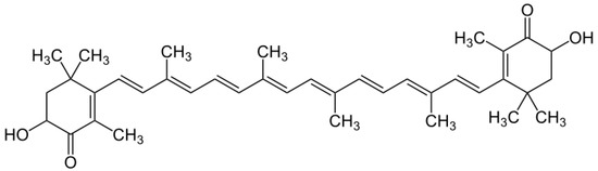 Cyanobacteria are also sources of carotenoids, the second major family of dyes useful in cosmetics. The main carotenoids are β-carotene, astaxanthin, lutein, lycopene, canthaxanthin and fucoxanthin [119]. The microalga strain Haematococcus pluvialis (Chlorophyceae, Volvocales) is considered to be the best natural source of astaxanthin (Figure 9) [120,121].