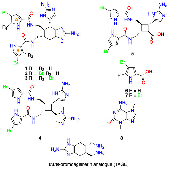 - Muñoz, J.; Köck, M. Hybrid Pyrrole-Imidazole Alkaloids from the Sponge Agelas sceptrum. J. Nat. Prod. 2016, 79, 434–437. [Google Scholar] [CrossRef]