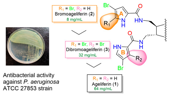 Isolation of the three ageliferins (1–3), which show slight structural differences, and assessment of their antibacterial activity allowed us to identify a relationship between the structure of the compounds and their activity against the P. aeruginosa ATCC 27853 strain. The structural comparison of the three ageliferins (1–3) in relation to the MIC values for this strain indicated that the presence of a second bromine atom at C-2 of pyrrol A ring increases the antibacterial activity. Thus, 1, which does not contain the atom, was less active than 2 and 3, in which the atom does occur (1 was eight times less active than 2 and two times less active than 3). However, the presence of a second bromine atom at C-2 of pyrrol B ring decreased the antibacterial activity because 2, which bears a hydrogen at C-2 of the pyrrol B ring was more active than 3, which bears a bromine atom at that position (2 was four times more active than 3) (Figure 2).