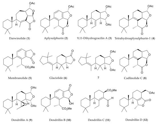 - Ankisetty, S.; Amsler, C.D.; McClintock, J.B.; Baker, B.J. Further membranolide diterpenes from the antarctic sponge Dendrilla membranosa. J. Nat. Prod. 2004, 67, 1172–1174. [Google Scholar] [CrossRef]