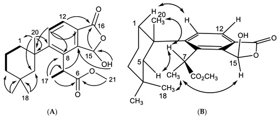 Dendrillin B (10) was obtained as a clear oil with spectral data similar to that of previously reported membranolide (5), but with differences among the NMR signals of key functional groups about the aromatic ring. A formula of C21H28O5 was established from HRESIMS. Key 1H NMR signals (Table 1), which established similarities to membranolide including gem methyl groups H3-18 (δH 0.36) and H3-19 (δH 0.93), and a singlet methyl H3-20 at δH 1.40 (Figure 2). H3-18 and H3-19 correlated in the HMBC spectrum to alkyl carbons C-5 (δC 51.1) and C-3 (δC 39.3). The HMBC correlation of H3-20 to C-5, taken with COSY correlations among H2-3 (δH 1.32), H-2α (δH 1.70), H-2β (δH 1.79), H-1α (δH 2.35), and H-1β (δH 1.50), defined the 4,4,10-trimethylcyclohexyl group familiar to membranolide. HMBC correlation of H3-20 to C-9 (δC 154.4) placed the trimethylcyclohexyl group on an aromatic ring defined by a pair of nearly overlapping aromatic protons shifted considerably downfield (H-11, δH 7.78) and (H-12, δH 7.76) and three quaternary carbons, C-8 (δC 136.6), C-13 (δC 125.9), and C-14 (δC 145.5). The lowfield position of the aromatic protons were indicative of conjugation, supported by an HMBC correlation of H-12 to carbonyl C-16 (δC 168.1). C-16 was found to be a carboxylate ester situated in a fused hydroxybenzofuranone ring system via an HMBC correlation from H-15 (δH 6.70) to C-16, of which H-15 is revealed to be a hemiacetal methine through an HMBC correlation between OH (δH 4.28) and C-15 (δC 97.3), as well as observation of coupling between H-15 and the hydroxy proton. The final substituent on the aromatic ring was found to be a methyl propionate ester ortho to the trimethylcyclohexyl group based on HMBC correlations from a doublet methyl H3-17 (δH 1.75; J = 7.5) to C-8 (δC 136.6) and C-6 (δC 176.6), which coupled to a quartet methine H-7 (δH 4.78, J = 7.3). H-7 displayed further HMBC correlations to C-9 and C-14 (δC 145.5). The final confirmation of the position of the terminal methyl ester is supported by an HMBC correlation from H3-21 (δH 3.67) to C-6 (Figure 2).