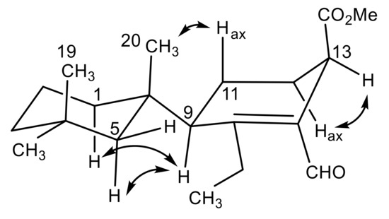 The relative configuration of dendrillin C (11) was approached by comparison with the other members of this family. Two distinguishing features characterize the planar structure of 11 than influence its conformation; one is the reduced (tetrahydro) central ring and the second is the methine at C-9. Aromatic central ring members of this family of D. antarctica metabolites have a well-characterized configuration with the central ring substituent occupying the axial position of the trimethylcyclohexane chair conformation. This is borne out both by X-ray analysis of, for example, aplysulphurin [26], membranoids C and E [15], and darwinolide [17], and the respective upfield shift of H3-19 (δH ~0.5) owing to its position in the anisotropic cone of the aromatic ring. H3-20, in the equatorial position, similarly has a characteristic deshielded shift (~δH 1.4). Dendrillin C lacks the shielded H3-19 (δH 0.92) and deshielded H3-20 (δH 1.03) indicative of its central ring in an equatorial position on the trimethylcyclohexane ring system (Figure 4). NOESY correlations from the axial methyl H3-20 to equatorial H-5β (δH 1.46) and axial H3-19 and from equatorial H3-18 (δH 0.98) to axial H-5α (δH 1.35), support the conformation of the trimethylcyclohexane system illustrated in Figure 4. H-7a (δH 2.43) has a NOESY correlation to H-5β, fixing the ethyl group in the proximity of C-5. The configuration at C-13 was established with the methyl ester in the β-orientation based on a NOESY correlation between H-13 (δH 3.60) and H-12α (δH 1.82), placing the H-13 methine in the pseudoequatorial orientation.