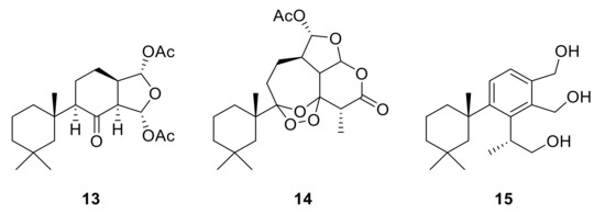 Structures of the semi-synthetic derivatives prepared from the major spongian diterpenes from Dendrilla antarctica. 8-Ketodihydrogracilin (13) and ozonide 14 were obtained from ozonolysis of 9,11-dihydrogracilin (3) and tetrahydroaplysulphurin-1 (4), respectively; Triol 15 from LiAlH4 reduction membranolide (5).