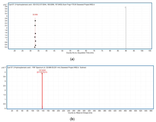 Three other phenolic acid derivatives were also detected, including two hydroxyphenylpentanoic acid derivatives and one hydroxyphenylacetic acid derivative. To our best knowledge, this is the first time these other phenolic acid derivatives have been reported in seaweeds. Phenolic acids are the predominant polyphenol compounds found in different seaweeds, which were characterized by using LC-MS in previous studies, and displayed remarkable antioxidant potential [44,45].