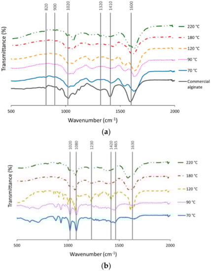 Figure 2a shows the FTIR spectra of the alginates obtained under the different hydrothermal conditions and after the CaCl2 (1%) precipitation step. Bands obtained at 1600 cm−1 were associated with the polymeric matrix of alginate, being the carboxylate asymmetric stretching vibration O-C-O exhibited []. The absorption at 1400 cm−1 corresponds to asymmetric stretching vibrations from uronic acids. Deformations of O-C-H and C-C-H were exhibited at 1320 cm−1 []. The peak at 1020 cm−1, assigned to the OH bending, was widened with increasing extraction temperature, suggesting some change (increase) in the mannuronate concentration [] and was less marked in the extracts obtained at 180–220 °C. The signal band at 900 cm−1 was associated with α-l-guluronic asymmetric ring vibration, whereas 820 cm−1 was attributed to the β-mannuronic acid residues [].