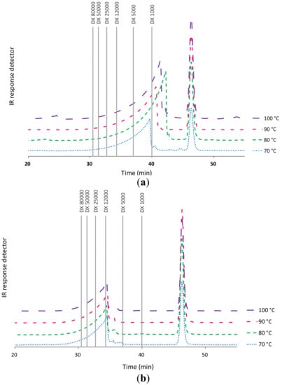 Data from high performance size exclusion chromatography (HPSEC) analyses shown in Figure 3a confirm the influence of temperature on the obtained alginate fractions. In fact, higher temperatures resulted in the generation of alginate fractions of lower molecular weight. Figure 3b shows that the severity of the hydrothermal treatment in the studied range did not significantly change the molecular weight profile of the fucoidan fraction. The chromatograms showed a broad peak corresponding to 12 kDa and a narrower one under 1 kDa. The increase in the final heating temperature during hydrothermal treatment promoted the modification of the molecular weight distributions of the corresponding alginates, suggesting the breakage of the polymer chains with the extraction temperature [].