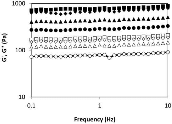 Hydrogels formulated with aqueous dispersions of recovered alginates in the presence of CaCl2 (1% w/w) were made at a commonly employed biopolymer content (2.0 g L−1) according to Azevedo et al. []. Small amplitude oscillatory-shear testing of above systems was performed on a controlled-stress rheometer (MCR302, Anton Paar, Ostfildern, Germany). A sand blasted plate–plate (25 mm) was used as measurement geometry. Above hydrogels were loaded on the plate with a 1 mm gap and the sample edges were covered with paraffin oil. Before mechanical measurements, hydrogels were allowed resting (5 min) to promote thermal stabilisation. Firstly, stress sweeps were made as reported elsewhere [] to determine the linear viscoelastic region (below 50 Pa). The viscoelastic behaviour (elastic, G’ and viscous, G’’ moduli) of tested samples was monitored with frequency at 25 °C within the linear viscoelastic region (at 20 Pa). Measurements were made at least in triplicate.