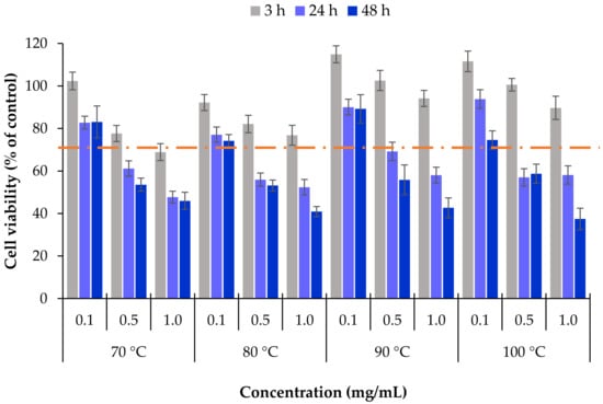 The cells were exposed to different concentrations of the extracts and cell viability determined after 3, 24 and 48 h. Figure 5 shows the obtained results. The first relevant observation is that a short-term exposure (3 h) did not have a toxic effect for any of the tested substances, independently of the concentration. Indeed, cell viability remained in all cases close to or clearly above 70%, which is the acceptable threshold for cytotoxicity according to ISO 10993 []. Nevertheless, prolonging the contact of the cells with the extracts up to 24 h and 48 h elicited strong decrease of cell viability, particularly evident at the more prolonged time (p < 0.05), where cell viabilities around 40% were registered in some cases. Regarding the effect of the concentration, signs of toxicity occurred only at 0.5 and 1 mg/mL. Analysing individually the extracts obtained at each temperature, there is a clear effect of the concentration, with significant decrease of cell viability with the increase of the concentration (p < 0.05). In parallel, cell viability decreased beyond 45% upon 48 h exposure to all the extracts at the concentration of 1 mg/mL, regardless of the temperature used in the extraction process. As a whole, a general effect of time and concentration was visible on HCT-116 cells (p < 0.05).