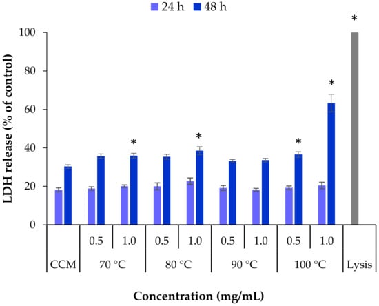 Lactate dehydrogenase (LDH) released from HCT-116 cells after 24 h and 48 h exposure to L. ochroleuca extracts obtained under different extraction temperatures. Data represent mean ± SEM (n ≥ 3). * p < 0.05 compared with the negative control (cell culture medium, CCM).