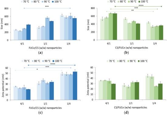 Effect of crude extracts of fucoidan/chitosan FUCe/CS (blue) and CS/FUCe (green) mass ratio on (a,b) size and (c,d) zeta potential of nanoparticles formulated using extracts obtained by hydrothermal extraction at different maximal temperatures. Data represent mean ± SD (n ≥ 3). Significant differences were represented by * for 70 °C, ** for 80 °C, *** for 90 °C, **** for 100 °C (p < 0.05), compared between ratios.
