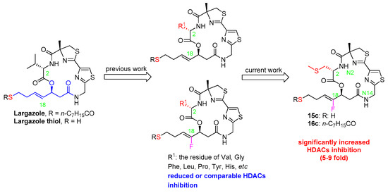 Largazole, as a potent and selective Class I HDAC inhibitor, was discovered in 2008 by Leusch et al. [8,9]. Due to its superior anticancer properties, this marine natural product has attracted widespread attention in the medicinal chemistry community [10,11,12,13,14,15]. In order to improve the inhibitory activity and selectivity of HDACs, great efforts have been made to modify the macrocyclic moiety, the hydrophobic linker and the warhead of largazole. Thus far, almost all the modifications on the linker and the warhead cause obvious losses in activity against HDACs, possibly due to preventing the thiol group to efficiently penetrate into the narrow channel containing the Zn2+ ion of HDACs and to coordinate it with the optimal geometry. In contrast, the modifications on the macrocyclic moiety seem to be allowable to some extent. Among them, certain variations in valine residue (Val) at the C2 position of largazole may maintain the HDACs inhibition despite with a little sacrifice in its potency or isoenzyme selectivity (Figure 1). For example, Hong and Leusch’s group reported that replacement of Val with Ala decreased the activity by three-fold in growth inhibition of HCT-116 [16]. Subsequently, they introduced aromatic (Phe, Tyr), acidic (Asp) or basic (His) amino acid residues at that position, but all the analogs exhibited reduced activity in HDAC1 [17]. Based on the hypothesis of potentially hydrophobic interactions between Val and the surrounding residues of HDAC1 (Tyr196 and Leu263), Jiang et al. replaced Val with Leu, Phe and Tyr, reporting that Tyr had about five-fold higher GI50 values of HCT116 and A549 cells compared to largazole despite with an increasing selectivity over normal cells [18]. Ganesan’s and Williams’ groups reported that replacement with Gly or Pro resulted in a significantly decreased inhibition against HDACs, respectively [19,20]. Recently, Hong’s group investigated again the effect of the replacement of Val with Phe, Tyr, Asp or His on both the activity and selectivity of the class I HDACs, and the observed His substitution showed comparable activity, and a slight selectivity towards HDAC1 over HDAC2–3. This slight selectivity was hypothesized to be resulted from a possible hydrogen-bond ability of His. However, when they replaced Val with a set of residues tagged with the terminal amine or amides, the results suggested that the hydrogen bonding interaction did not play an essential role in HDAC inhibition [21]. All these works indicated that the structural optimization at the C2 position appeared not to improve the potency of HDACs inhibition.