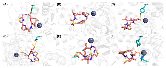Proposed binding mode of Largazole thiol (carmine carbon sticks) with (A) HDAC1 (5ICN), (B) HDAC6 (5EDU) and (C) HDAC8 (4RN0). Proposed binding mode of 15c (carmine carbon sticks) with (D) HDAC1 (5ICN), (E) HDAC6 (5EDU) and (F) HDAC8 (4RN0). Atom color code: red = oxygen, blue = nitrogen, white = hydrogen, yellow = sulfur, cyan = fluorine. Hydrogen bonds between the ligand and receptor are indicated by yellow dashed lines.