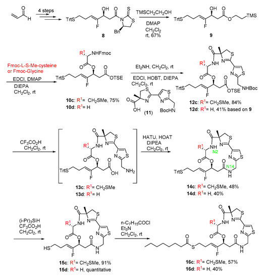 The key fluoro fragment (8) was prepared from acrolein via four steps according to our previous method [23]. Alcoholysis of 8 with TMSCH2CH2OH in the presence of DMAP provided 9 in good yield (67%). Condensation of 9 with S-Me Fmoc-l-Cystine or Fmoc-Glycine in the presence of EDCI, DMAP and DIEPA afforded ester 10c and 10d (yield: 75% for 10c). Removal of Fmoc group of 10c or 10d with Et2NH in CH2Cl2 and subsequent condensation with the acid (11) resulted in the linear precursors (12c, 84%; 12d, 41% based on 9). Deprotection of Boc group of 10c or 10d with CF3CO2H in CH2Cl2 and subsequent release of free acid provided the linear depsipeptides (13c and 13d) exposed at the N- and C-terminus, respectively. The depsipeptides were then subjected to the optimal cyclization condition (HATU/HOAT/DIPEA in anhydrous CH2Cl2 solution with a diluted concentration of about 0.001 M). The macrolactamization yields were 48% for 14c and 40% for 14d in two steps, respectively. Compared to our previous cyclization at N2 position, cyclizing at N14 position afforded apparently improved yield. Following our previously reported procedure [24], the free thiol 15c and 15d were obtained through deprotection of Trt group from 14c and 14d, respectively. The subsequent acylation with n-C7H15COCl under the standard condition led to the final fluoro analogs 16c and 16d (yields: 57%, 40%), respectively.