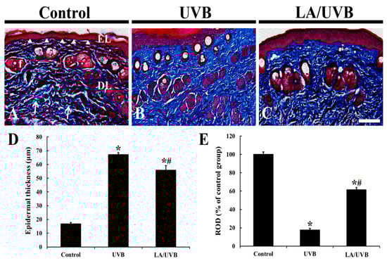 Collagen fibers in the dermis of the control group were stained with blue dye and abundantly found (Figure 1A), showing that thin and dense collagen bundles were easily observed throughout the dermis (Figure 1A). In the UVB group, dense collagen bundles stained with dark blue dye were remarkably decreased (about 17.7% of the control group) compared to those in the control group, showing that collagen fibers were destructed (Figure 1B,E). However, in the LA/UVB group, the density of collagen fibers was increased (about 61.4% of the control group) compared to that in the UVB group (Figure 1C,E).