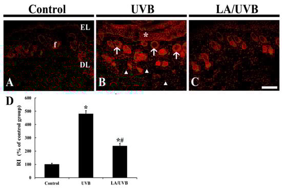 (A–C) Dihydroethidium (DHE) fluorescence staining in the control (A), UVB (B) and LA/UVB (C) groups at 5 days after UVB exposure. In the UVB group, DHE fluorescence is significantly increased in the epidermis (EL) (asterisk) and dermal hair follicles (f) (arrows) and collagen-like fibers (arrowheads). However, in the LA/UVB group, DHE fluorescence in the structures is significantly lower than that in the UVB group. DL, dermal layer. Scale bar = 100 μm. (D) RI of DHE fluorescence structure at 5 days after UVB irradiation. The bars indicate the means ± SEM (n = 7/group; * p < 0.05 vs. control group, # p < 0.05 vs. UVB group).