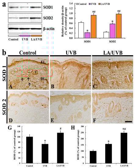 (a) Representative blot images and quantitative analysis of SOD1 and SOD2 protein levels in the dorsal skin of the control, UVB and LA/UVB groups at 5 days after UVB irradiation. Bars indicate the means ± SEM (n = 7 at each group, * p < 0.05 vs. control group, # p < 0.05 vs. UVB group). (b) SOD1 (A–C) and SOD2 (D–F) immunohistochemistry in the dorsal skin in the control (A,D), UVB (B,E) and LA/UVB (C,F) groups at five days after UVB exposure. In the control group, SOD1 immunoreactivity is shown in the epidermal layer (EL), hair follicles (f) and fiber-like structures (arrows). SOD1 immunoreactivity in these structures is decreased in the UVB group, but significantly higher in the LA/UVB group than the control group. SOD2 immunoreactivity in the control group is found in the EL and f. SOD1 immunoreactivity in the structures is increased in the UVB group and more increased in the LA/UVB group than the control group. DL, dermal layer. Scale bar = 100 μm. (G,H) ROD of SOD1 (G) and SOD2 (H) immunoreactive structures in all groups at five days after UVB irradiation. The bars indicate the means ± SEM (n = 7/group; * p < 0.05, vs. control group, # p < 0.05 vs. UVB group).