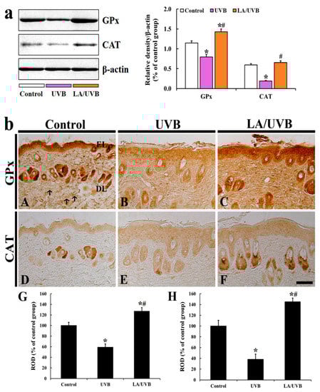 (a) Representative blot images and quantitative analysis of GPx and CAT protein levels in the dorsal skin of the control, UVB and LA/UVB group at five days after UVB irradiation. Bars indicate the means ± SEM (n = 7 at each group, * p < 0.05 vs. control group, # p < 0.05 vs. UVB group). (b) GPx (A–C) and CAT (D–F) immunohistochemistry in the dorsal skin in the control (A,D), UVB (B,E) and LA/UVB (C,F) group at five days after UVB exposure. Strong GPx immunoreactivity in the control group is shown in the epidermal layer (EL), hair follicles (f) and fiber-like structures (arrows). GPx immunoreactivity in the structures of the UVB group is significantly decreased, but significantly higher in the LA/UVB group than the control group. CAT immunoreactivity in the control group is shown in the EL and f. CAT immunoreactivity in the UVB group is significantly decreased but CAT immunoreactivity in the LA/UVB group is significantly higher than that in the control group. DL, dermal layer. Scale bar = 100 μm. (G,H) ROD of GPx (G) and CAT (H) immunoreactive structures in all groups at 5 days after UVB irradiation. The bars indicate the means ± SEM (n = 7/group; * p < 0.05, vs. control group, # p < 0.05 vs. UVB group).