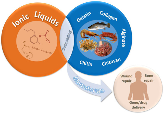 Particularly, the use of ILs to extract marine polysaccharides like agarose, chitin, carrageenan from their sources, residues, or even waste is a sustainable approach that has been indicated as easy and highly efficient, as compared to the conventional methods of extraction [7,22]. Besides polymer extraction, many studies have also shown the potential of ILs as suitable platforms for the production of 2D and 3D-based marine polymers, namely gels, films, micro/nanoparticles, and sponges. Given the performance of these matrices, they have been proposed as wound dressing, drug delivery, bone repair, and gene delivery systems. Therefore, this review is focused on the overview of the properties, strategies, and biomedical applications of marine-derived polysaccharides processed in different ILs (see Figure 1).