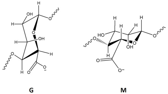 Alginate is a linear polymer with a high abundance in nature [21]. It is present in the cell wall of brown algae, playing not only a structural function but also being involved in ionic exchange mechanisms. Alginate is an unbranched polysaccharide composed of β(1-4)-linked D-mannuronic acid (M) and α(1-4)-linked L-guluronic acid (G) (Figure 2), which are stereoisomers and differ in the composition of the carboxyl group [1,43]. M and G units can be present in blocks of (M and G) or mixed (MG) [1].