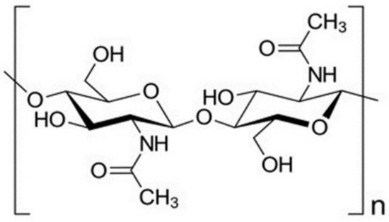 Chitin is the second most abundant natural polymer, just after cellulose [46]. It is found in the shell of crustaceans, squid pens, fungi, and cuticles of insects [46,47]. Structurally, chitin is composed of a long chain made up of β (1→4)-linked primary units of N-acetyl D-glucosamine [48,49,50] (Figure 3). Chitin is characterized by its degree of acetylation (DA), which is defined as the ratio of 2-acetamido-2-deoxy-d-glucopyranose to 2-amino-2-deoxy-d-glucopyranose structural units, which is typically 0.90, indicating the presence of about 5-15% of amino groups due to deacetylation that might occur during chitin extraction [50].