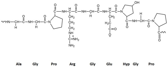 Gelatin is the partially hydrolyzed form of collagen. Although their sources are bovine and porcine skin, some studies demonstrated their extraction from marine sources such as sponges and fish skin [43]. The chemical composition of gelatin depends on the source, but hydrophobic amino acids like proline (Pro), hydroxyproline (Hyp), and glycine (Gly) are more likely to be present in gelatin. The general primary sequence is given by (Gly-X-Pro) and (Gly-X-Hyp), in which X represents other amino acids [92]. In Figure 5 is presented the model structure of gelatin.